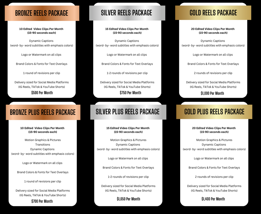 Monthly packages of social media clips/reels you would like to be made out of your video content.